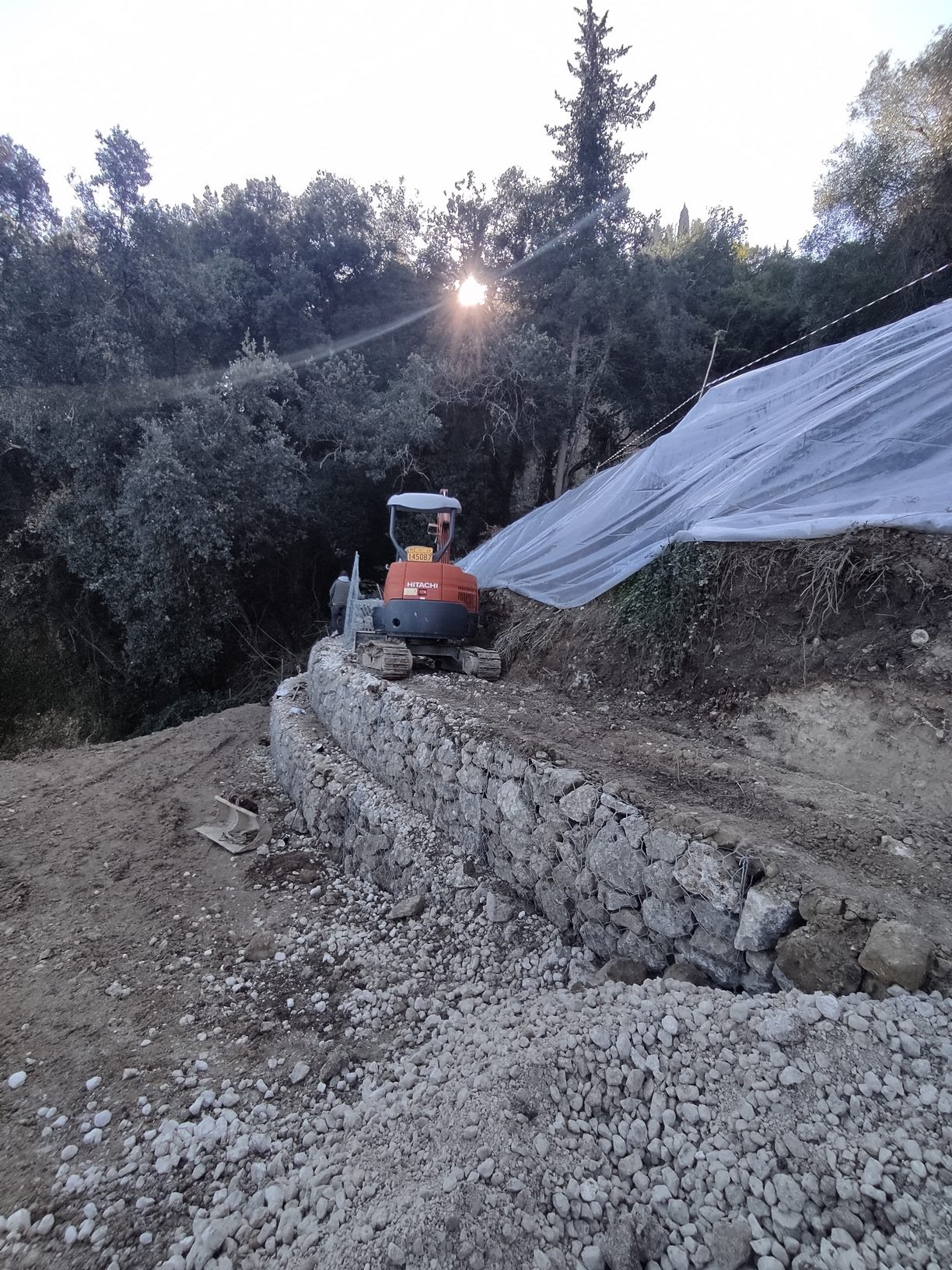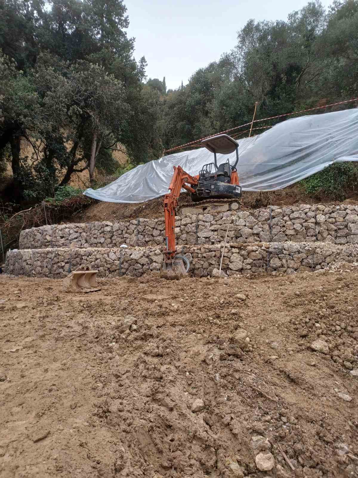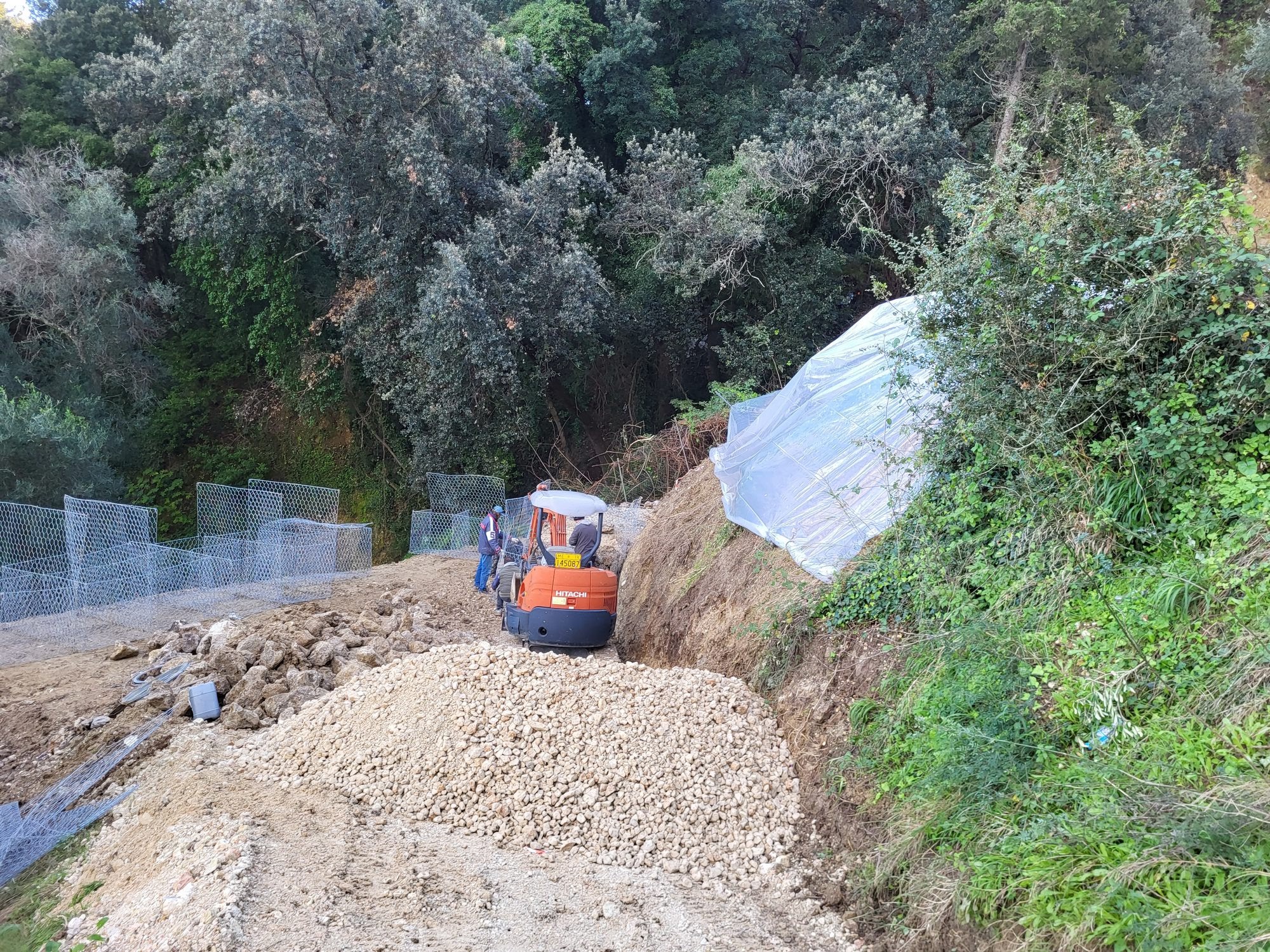 Dmitris the Excavator and his team started to erect the reinforcement structure. After two weeks, more than 100 tonnes of stone had already been laid in the gabions. By hand, stone by stone. The work was unfortunately interrupted by rains every few days, but it looks like the risk of the road falling on our plot has been averted.