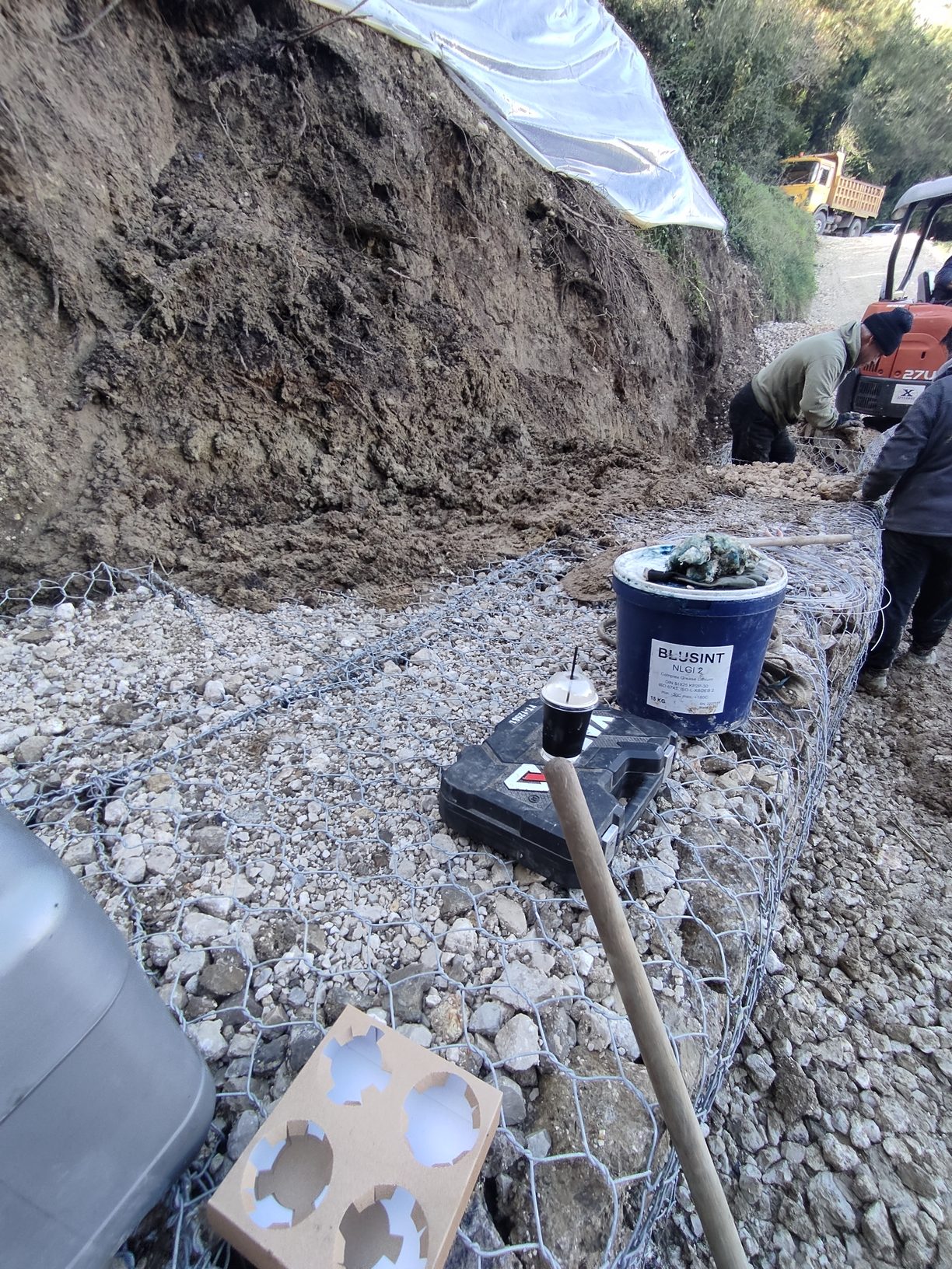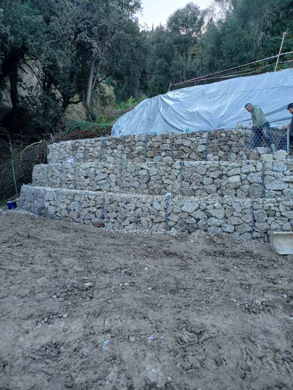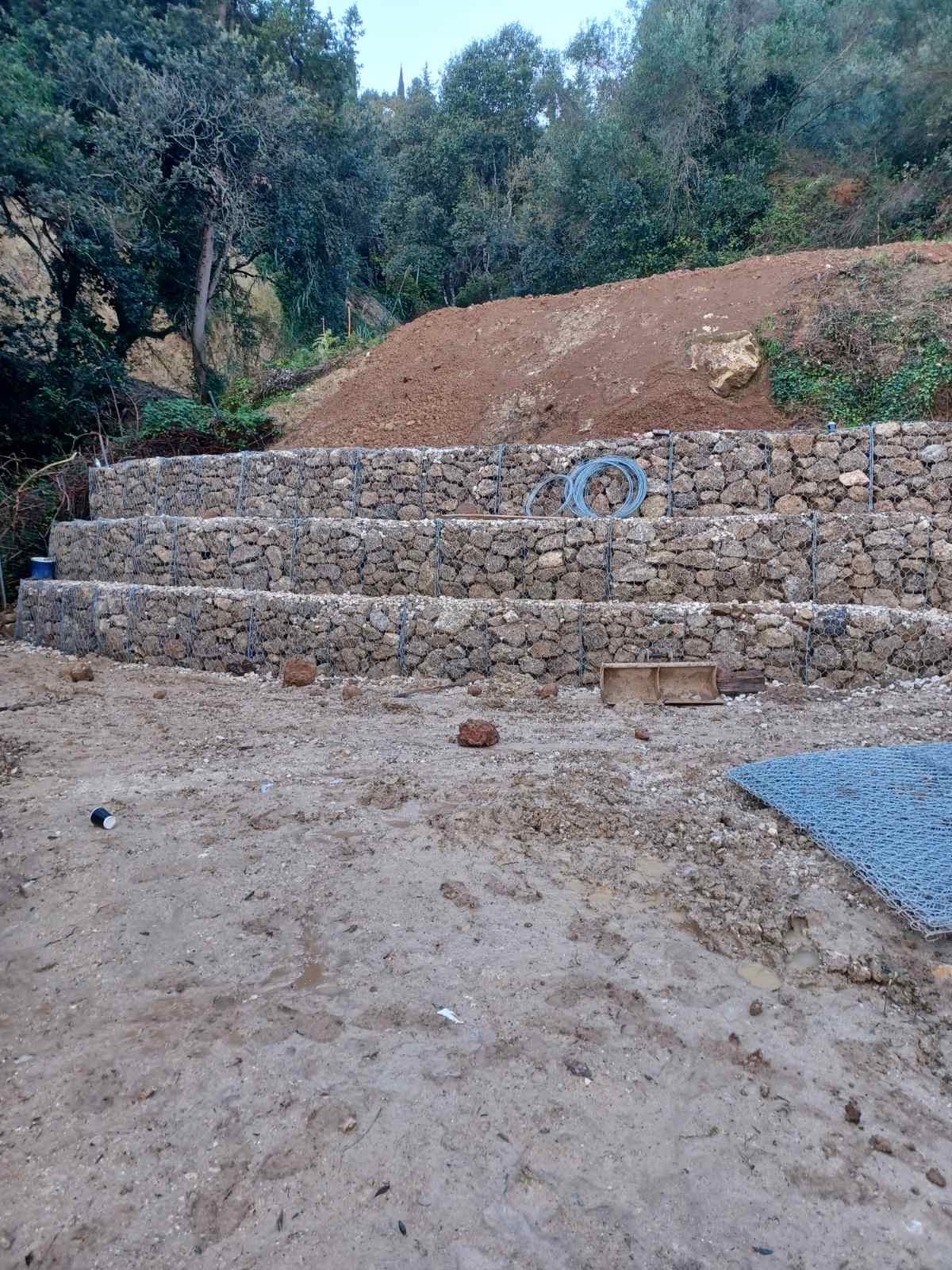 Dmitris the Excavator and his team started to erect the reinforcement structure. After two weeks, more than 100 tonnes of stone had already been laid in the gabions. By hand, stone by stone. The work was unfortunately interrupted by rains every few days, but it looks like the risk of the road falling on our plot has been averted.
