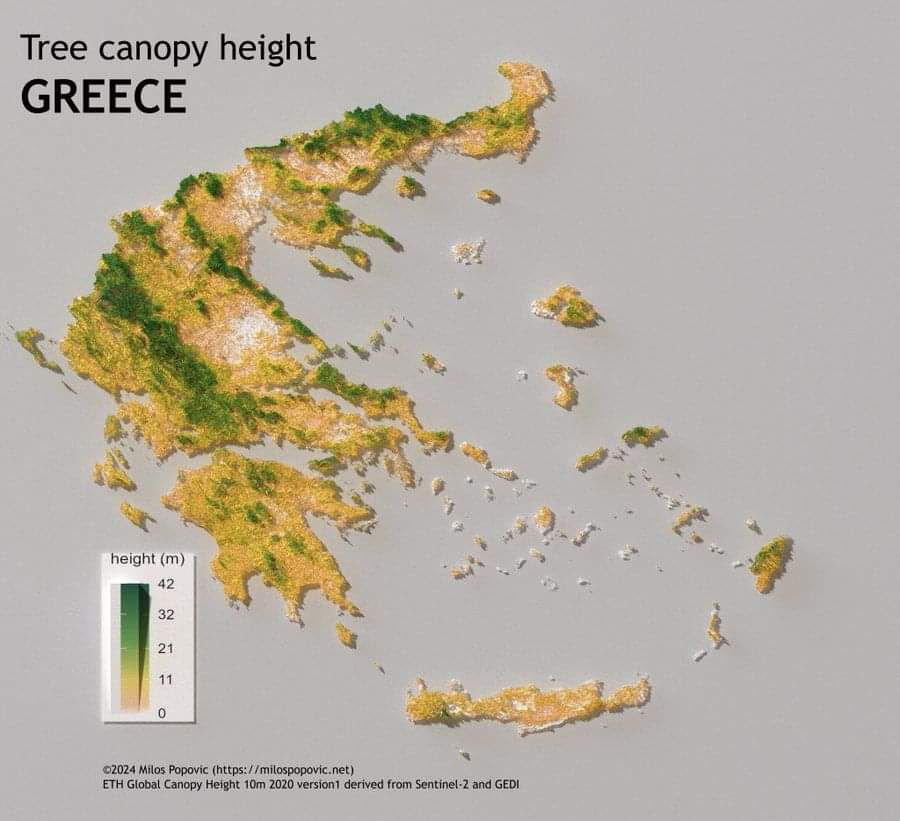 The greenery consists mainly of oak forests with crown heights above average for the whole of Greece (see photo below), olives, of which there are more than 4 million (meaning an average of one tree in every square of 12 metres), and a whole host of Mediterranean shrubs, herbs and flowers.