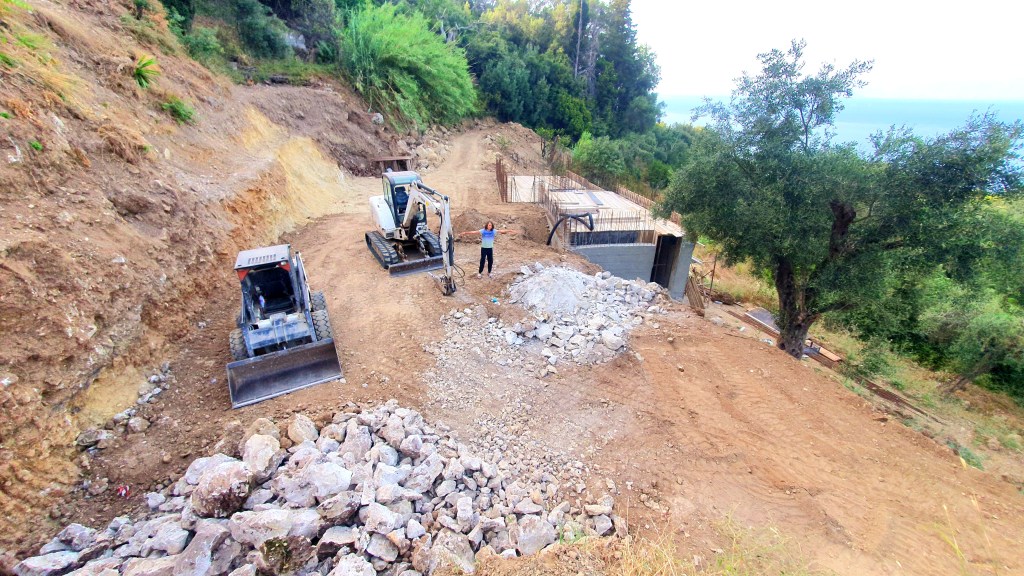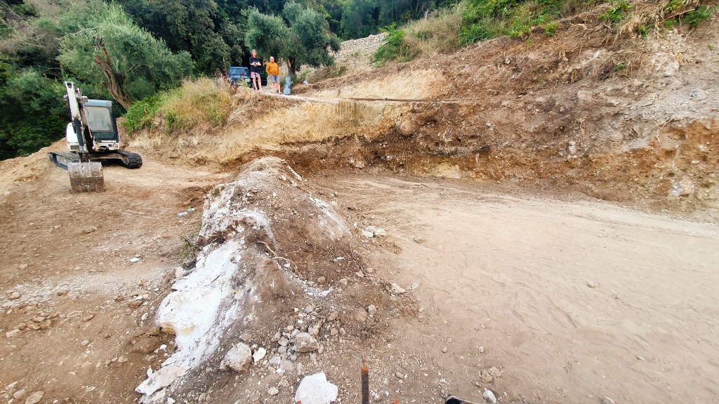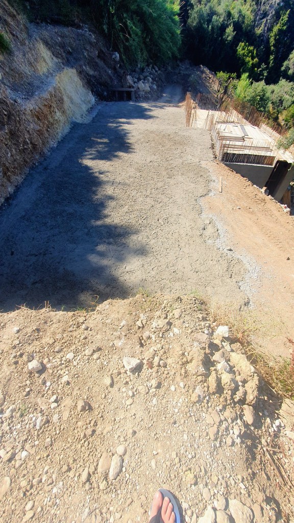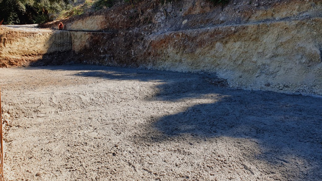 It also turned out that the rock we had suspected for more than a year was quite formidable and underneath the future kitchen. Instead of removing it, it has been cut down from above and will thus, alongside the watertank, provide a natural support for the house. It wasn’t easy – 2 days of extra jackhammer work.
